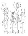 FIG. 106ashows a side view of the distal end of a stent basket of this invention. The construction illustrated shows a means of connecting the distal end of anouter member9905 and aninner member9901 which can accommodate a change in length of both members during either loading or expansion.Outer member9905 comprisesmultiple strut elements9911, at least some of which terminate atcollar9906, which is in turn connected to tipcoil9907, which terminates atdistal collar9908.Inner member9901 comprisesmultiple strut elements9910, at least some of which terminate atcollar9903, which is in turn connected tospring coil9902, which is in turn connected to anelongate strut9904.Elongate strut9904 runs throughtip coil9907 and is joined to the outer member atdistal collar9908. Suitable methods of joining include soldering, adhesive bonding and laser welding. A distalround end9909 is situated at this joint to provide a smooth and atraumatic end to the device. Thisdistal end9909 could be formed by a solder, such as tin/silver or gold based, or an adhesive such as a light curing epoxy. Aradiopaque element9912 may be fitted overelongate strut9904 and undertip coil9907 to render the tip visible under fluoroscopy, and may comprise a coil of wire made from a radiopaque material such as platinum or similar, or may comprise a tube of a polymer material loaded with a radiopaque filler such as tungsten or tantalum or barium sulphate for example.