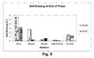 FIG. 8 of the accompanying drawings shows a trace similar to that ofFIG. 7 but taken after additional of a small amount of the salt tetrabutylammonium chloride to the emulsion used to prepare the display, the emulsion being otherwise unchanged. By comparingFIG. 8 withFIG. 7, it will be seen that addition of the salt substantially lowers the self-erasing. The exact data plotted inFIGS. 7 and 8 are as shown in Table 4 below (“WSSE” is white state self-erasing, “DSSE” is dark state self-erasing and “TSSE” is total self-erasing).