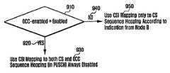 FIG. 8 illustrates the interpretation by an Advanced-UE of the mapping from the CSI values to CS and OCC values. If the NodeB indicates810 that either group sequence hopping or sequence hopping within a group is enabled820, an Advanced-UE assumes that the CSI indicates onlyCS values830, for example using the mapping in Table 1. Otherwise840, an Advanced-UE assumes that the CSI indicates both CS andOCC values850, for example using the mapping in Table 2.