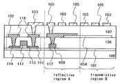 As shown inFIG. 65, theconductive layer402 shown inFIG. 4 is not formed and thereflective electrode652 is formed in the reflective region. After that, thereflective electrode652 is covered with agate insulating layer412 of thethin film transistor160. An opening is formed in thegate insulating layer412 and the insulatinglayer106, and thereflective electrode652 and thethird electrode105 are connected through the opening.