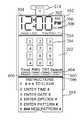 Turning now toFIG. 3, a perspective view of a front panel of an in-wall light timer having a display according to another embodiment of the present invention is shown. According to the embodiment ofFIG. 3, adisplay302 could be implemented. While a display may not be necessary to implement the timer with pre-stored timing patterns, the display may be desirable to provide information regarding stored data, including a selected timing pattern for example. That is, even though a display is not necessary in view of the use of pre-stored timing patterns, a user may desire a display for aesthetic reasons, because they are simply used to having a display, or for what information it does provide. As shown inFIG. 3, the display includes atime field304 which displays the current time during normal operation, an AM/PM field306, an on/offfield308 indicating the state of a light or appliance which is attached to the timer. Finally, aninformation field310 includes other information related to the operation of the timer. For example, the information field could include the current date and the timing pattern number. The timing field could include other information, such as DST code or whether a security code is used, as will be described in more detail below. Based upon the current time, date and security code information, a user could determine whether the timer is set with the correct data and should be operating correctly. As shown inFIG. 4 which shows the embodiment ofFIG. 3 with the cover in the open position, the user interface could be implemented in with the user interface.