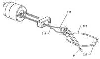 As shown inFIG. 2D, thefirst suture loop221 may be also displaced, looped or passed, back through itself, e.g., in the direction of arrow P, in order to secure thefirst suture loop221 and thefirst locking member223 to thefirst loop217 of thefirst guidewire211. As discussed above, in one or more embodiments, thefirst suture loop221 may be formed from any flexible material known in the art, such as suture, plastic, or a malleable metal, such as Nitinol. In one or more embodiments, thefirst suture loop221 may be a closed, continuous loop. Alternatively, in one or more embodiments, thefirst suture loop221 may be closed and may contain a knot (not shown).