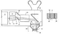 In the special embodiment of the invention, the eye is pressed by means of asuction ring32 against acontact glass31 which is either plane or preferably essentially adapted to the curvature of the cornea. The suction ring is fixedly connected with the outlet window of the laser device which provides for a defined position of the cornea relative to the laser focus. The expanded femtosecond laser beam is focused in the cornea byoptics24. A beam splitter which is highly reflective for the laser wavelength and transmits visible light reflects the laser beam in the beam path of a surgical microscope which is used for observing and centering the eye. The focusingoptics24 form a part of the microscope objective. Together with bundling optics, a real intermediate image of the cornea can be generated and can be observed three-dimensionally with thestereo eyepiece80. Thebeam deflection unit23 deflects the expandedlaser beam15 vertical to its propagation direction. Accordingly, the laser focus can be directed to different points in the cornea. The depth of focus can be varied by displacing the focusingoptics23 along the optical axis or by adapting the focal length of the focusing optics.
