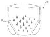 According to an aspect of the invention,FIGS. 1-3 show anabsorbent article10 in an unfastened and uncontracted state that has a liquidpermeable topsheet12, a liquidimpermeable backsheet14, a liquidabsorbent core16 disposed between thetopsheet12 and thebacksheet14, further comprising aliquid indicator20. Theliquid indicator20 comprises acoating18 of liquid indicating ink disposed on thebacksheet14, between thebacksheet14 and theabsorbent core16, such that it is visually revealed when thecoating18 is wetted with body fluids. The liquid indicator is the liquid-activated formulation as described above. This liquid indicator may change color entirely when in contact with liquid, or may change noticeable shades of color, or may change from an almost white (so as it appears that there is no colorant there) to a color, or may change from a color to a white/colorless state.FIG. 2 shows an example of how the absorbent article may appear when wet, wherein theliquid indicator20 appears in a raindrop pattern that is visible when wet. The liquid-activated formulation may be a single layer.