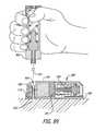 A cannula inserter (or “inserter”) may then be secured to thepump assembly200′ (Step S117). One exemplary inserter, which is generally represented byreference numeral800 inFIG. 85, may include amovable member802 within ahousing804, and a trigger-type actuator806 that acts on the movable member. Theexemplary actuator806 may have arotatable trigger808 and a compressed spring orother biasing device810. Atrocar812 is carried on themovable member802. Acannula600′ is pre-mounted on thetrocar812 such that the sharp end of the trocar extends beyond thecannula tube612. Theinserter800 may also be configured to withdraw the trocar back into thehousing804 after the cannula is deployed.