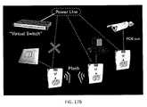 FIG. 17B illustrates a variation providing Enterprise PLC. In this example, a power over Ethernet (POE) module coupled to an Ethernet port. In other variations, the circuitry is adapted to include additional communication e.g. wireless access point or a mesh node.FIG. 16D illustrates a system using power receptacle wireless access point devices such as those shown above. Each of the POE access points may be connected to a device using an Ethernet cable. The devices may include switches, phones, and cameras. In addition, the power receptacle wireless access point devices may also act to provide a wireless connection port (AP) for other devices within the structure. In some variations, as mentioned above, the devices may connect through the power line to a switch or virtual switch.
