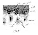 FIG. 3 is an enlarged, partially segmented perspective illustration of a fluid pervious, macroscopically-expanded, three-dimensional polymeric web80 as taught in U.S. application Ser. No. 10/324,366, filed Dec. 20, 2002, and entitled Polymeric Web Exhibiting a Soft and Silky Tactile Impression. The geometric configuration of the macroscopic surface aberrations, e.g.,primary apertures71, of the polymeric web can be generally similar to that of theweb40 illustrated inFIG. 1.Primary apertures71 may be referred to as “apertures” or “macro-apertures” herein, and refer to openings in the web that permit fluid communication between afirst surface90 ofweb80 and asecond surface85 ofweb80. Theprimary apertures71 of the web shown inFIG. 3 are defined in theplane102 offirst surface90 by a continuous network of interconnecting members, e.g.,members91,92,93,94, and95 interconnected to one another. The shape ofprimary apertures71 as projected in the plane of thefirst surface90 may be in the shape of polygons, e.g., squares, hexagons, etc., in an ordered or random pattern. In a preferred embodimentprimary apertures71 are in the shape of modified ovals, and in one embodimentprimary apertures71 are in the general shape of a tear drop.Polymer web80 exhibits a plurality ofsurface aberrations220 in the form of hair-like fibrils225, described more fully below. For webs of the type depicted inFIG. 3 having bothmacro-apertures71 and hair-like fibrils225 extending fromfirst surface90, the caliper H is the dimension fromplane106 ofsecond surface85 to a plane of a surface corresponding generally to the distal ends226 of hair-like fibrils225.