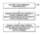 FIG. 40 illustrates an embodiment of the present invention of usingmonitoring device10 andbuilding gateway system910. As shown instep968,monitoring device10 receives a user command. The user command may include command entry through a button interface. Alternately, the user command may be a digitized voice command. As shown instep970, a data signal associated with and responsive to the command is transmitted to the building gateway system using a wireless link. The wireless link may utilize various protocols and standards such as (900 MHz, and the like), 802.11 (Wi-Fi™), BLUETOOTH®, and ultra-wideband (UWB), among others. The building gateway system then sends a control signal based on the command to an Controllable Device, as shown atstep972. The control signal may be sent through various interfaces including infrared, X10, structural wiring, and wireless interfaces, among others. The control signal can controlvarious Controllable Devices912, as recited above, among other equipment located in a building.