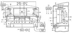 Thesupport plate55 is supported by threesupport servos80,85,90 placed at equal (120 degree) intervals on theshoulder ring40. Thesupport servos80,85,90 are identical in one embodiment, and each consists of asupport base100 fastened to a top surface of theshoulder ring40, a rail and runner block (rail module)105 and a servo motor (motor module)110. In the illustrated embodiment, the rail and runner block105 is fastened to thesupport base100 while theservo motor110 is fastened to the rail and runner block105, although this relationship may foe modified or reversed in other embodiments. Theservo motor110 rotates adrive pulley112 and the rail and runner block105 has a drivenpulley114, thepulleys112,114 being linked by adrive belt116. The rail and runner block105 has a vertically actuated, elevator block118 constrained by a linear verticalinternal rail120 within the rail and runner block105, theelevator block118 being lifted or depressed along thevertical rail120 depending upon whether the drivenpulley114 is rotated clockwise or counter clockwise. The elevator block includes aradial arm130 that extends over the floatingsupport plate55. Avertical strut135 supported by theradial arm130 extends downwardly toward thesupport plate55. A conventional rotatable ball joint140 is coupled between thestrut135 and thesupport plate55. Movement of theelevator block118 raises or lowers the portion of thesupport plate55 nearest the servo, depending upon whether theelevator block118 travels up or down. Movement of thesupport plate55 in most instances causes theplate55 to yaw or roll slightly, which in turn causes the ball joint140 to articulate. Optionally, alimit switch150 may extend laterally from theelevator block118, and upper and lower limit stops155,160 may actuate thelimit switch150 whenever the elevator block reaches predetermined top and bottom end-of-travel points determined by the locations of the limit stops155,160. Acontrol signal cable170 furnishes electrical control signals and power from acentral controller175 of the reactor ofFIG. 1. Thecentral controller175 controls each of the threesupport servos80,85,90. Placement of the threesupport servos80,85,90 at equal intervals around theshoulder ring40 enables thecontroller175 to rotate the floatingsupport plate55 about any tilt axis oriented along any azimuthal angle θ relative to an axis of symmetry of thereactor chamber16.