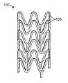 A stent may include a pattern or network of interconnecting structural elements or struts.FIG. 1 depicts a view of astent100. In some embodiments, a stent may include a body, backbone, or scaffolding having a pattern or network of interconnectingstructural elements105.Stent100 may be formed from a tube (not shown). The structural pattern of the device can be of virtually any design. The embodiments disclosed herein are not limited to stents or to the stent pattern illustrated inFIG. 1. The embodiments are easily applicable to other patterns and other devices. The variations in the structure of patterns are virtually unlimited.