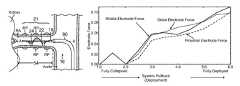 FIG. 7 is a diagrammatic plot of force exerted (during deployment of a shaping structure) by each of three electrodes on a helical shaping structure having a reverse tapered shape according to an embodiment of the invention, as calculated by finite element analysis.