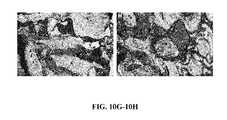 FIG. 10 illustrates thin (e.g., 4-6 μm) decalcified sections of the composite bone void filler injected in bilateral femoral plug defects in rats stained with fuchsin red-toluidene blue. (A)-(C): Low magnification images showing host bone (labeled “HB”, light gray), residual polymer (labeled “P”, dark gray), allograft particles embedded in polymer that have not been resorbed (labeled “A”, light gray), regions of active remodeling (labeled “RM”, medium gray) into the interior of the composite, osteoid (labeled “O”, medium gray), and bone marrow (labeled “BM”, medium gray) around the surface of the material. Panel (A) corresponds to the case where the wound was closed immediately after injection of the material, while Panels (B) and (C) correspond to the case where the wound was closed 15 minutes after injection. (D)-(F): Higher magnification views of the implant shown in Panel (C). (G)-(H) Higher magnification of regions of active remodeling characterized by allograft (light gray) resorption, cells (dark gray), and collagen deposition (medium gray). Panel (G) shows the cellular pathway in an interior region of the composite, while Panel (H) shows the infiltration of cells into the composite from the bone marrow. In the center of Panel (H) there is an allograft particle undergoing active remodeling that appears to be embedded in polymer except for a small breach (labeled “B”) where cells infiltrated along the allograft/polymer interface.