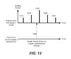 The result of each of these comparisons can be a comparison value that is Boolean (e.g., the second player was within a predefined threshold of accuracy), and/or proportional indicating how close the second player's performance was to the first player. The second player's total score can be the result of a single comparison (e.g., the players' torso position) or can be the result of combining multiple comparison values (e.g., the players' torso, arm, and leg positions). Every frame of the second player's performance can receive a corresponding score, which can be combined (e.g., averaged) to determine a total score for the second player's performance. While the previous paragraph describes a one-to-one frame comparison between the players' performance, other configurations are possible. As another example, the game platform can compare each input frame of the second player's performance to multiple frames of the model of the first player's performance (referred herein as target frames and/or references frames) to create an averaged score. For example, referring also toFIG. 12, asingle input frame1205 from the second player's performance can be compared with and scored against fivetarget frames1210 through1230 from the model created from the first player (e.g., as described above). The target frames1210 through1230 can be the five frames that are closest in time to theinput frame1205. The body characteristics of the second player in theinput frame1205 can be compared with the first player's body characteristics in each of the target frames1210 through1230. The score generated by each of the five frames can be scaled depending on how close in time that target frame is to theinput frame1205. For example, the target frame closest in time to theinput frame1205 can be scaled at 95%, while the next two closest reference frames can be scaled at 50%, while the last two remaining target frames can be scaled at 20%. The scaled scores can then be combined (e.g., averaged) to derive a score for the input frame1205 (which can then be combined with the scores for other reference frames that are each compared with five other reference frames). Additionally and/or alternatively, the score can be generated by selecting the single target frame that results in the highest score (weighted or unweighted). WhileFIG. 12 refers to five of the reference frames, other number of reference frames can be used. Other scoring methods are possible. The target and/or input frames can be created by simply storing the information provided from the camera system (e.g., the skeleton) and/or other signal processing techniques (e.g., smoothing, transformations, normalization, etc.). can also be applied to the information from the camera system to generate the target and/or input frames.