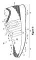 Referring toFIGS. 5 and 6, inlaidstrand132 repeatedly extends fromperimeter edge133 towardinner edge135 and adjacent to a side of onelace aperture123, at least partially around thelace aperture123 to an opposite side, and back toperimeter edge133. When knittedcomponent130 is incorporated intofootwear100, knitelement131 extends from a throat area of upper120 (i.e., wherelace122,lace apertures123, andtongue124 are located) to a lower area of upper120 (i.e., whereknit element131 joins withsole structure110. In this configuration, inlaidstrand132 also extends from the throat area to the lower area. More particularly, inlaid strand repeatedly passes throughknit element131 from the throat area to the lower area.