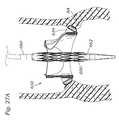Finally,FIG. 27C shows the secondaryexpandable valve652 after having been outwardly expanded into intimate contact with the inner surface of thetubular frame600. This effectively sandwiches into aframe600 between the two valves, creating additional interference and enhanced retention force, and decreasing the likelihood of migration. This is particularly useful for larger sized surgical valves. Again, the orifice defined by the expandedvalve652 is desirably at least as large as the original inner diameter of thesurgical valve650. Thesecondary valve652 may be expanded using aballoon670, as shown, or via a mechanical expander. Alternatively, thesecondary valve652 may be self-expanding, with theadapter frame600 being plastically-expandable to provide a robust force holding the primarysurgical valve650 in its expanded configuration. A self-expandingsecondary valve652 thus comes into intimate contact with thetubular frame600, and the frictional contact therebetween may be supplemented by the aforementioned barbs described above with respect toFIGS. 25-26.