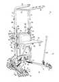 In the embodiment ofFIG. 1, thevertical beams36 and37 are split, the upper portions being telescopically received in the lower portions and a lift mechanism is provided to move the upper portion between the up and down positions. Such mechanism includes alever190 connected to arotating bar191 that is pivotally connected to a pair ofrods193 and194 that are connected at their upper ends (at195 and196) to theupper beams201 and202. Rotatingbar191 raises theupper beams201 and202 to give another four to eight inches of height. Thus, the various hooks204 along the upper equipment support arms can services taller peoples and can accommodate other exercise equipment and routines that might not otherwise be available. The ability to then lower the upper frame portion is important to enableportable rehab station10 to be able to pass through standard doorways.