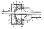 At least twoball bearings68 are disposed between fixed androtating rings52,54.Ball bearings68 may be freely disposed withintrack66 to travel aroundtrack66 and radially rotate about the longitudinal axis “t,” as well as spin about themselves.Ball bearings68 may be held constant by a ball bearing holder (not shown) withintrack66 so that theball bearings68 may only spin, for example, in an internal ring such as in thrust, rolling, or ball and groove bearing assembly. Alternatively, fixedring52 may include the ball bearing holders so that an area of theball bearings68 is exposed for contact with rotatingring54.