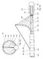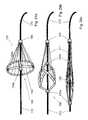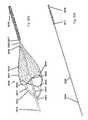 FIGS. 119aand 119bshows anotherbasket frame911 according to the invention. The basket frame has atether connection912 at the distal end. The frame may be constructed from a cut sheet of material. The frame may be constructed from cut tubular material. The frame may be constructed of wire material. The frame may be constructed of ribbon material. The material may be Nitinol. In the frame ofFIGS. 119aand 119bthepull tether21 in integrally attached to the frame. It will be appreciated that the pull tether may be attached by other means such as welding, laser welding, bonding, or tied to the basket frame. The frame inFIG. 119 haseyelets6 as net attachment points.