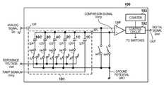 In the example inFIG. 1, although the analog signal Sin is supplied to the non-inverting terminal of the comparator CMP, and the comparison signal Vcmp is supplied to the inverting terminal of the comparator CMP, other configurations may be possible as long as the magnitude comparison between the value of the analog signal Sin and the value of the comparison signal Vcmp is possible. For example, a difference between the analog signal Sin and the comparison signal Vcmp may be supplied to the non-inverting terminal of the comparator CMP, and the ground potential GND may be supplied to the inverting terminal of the comparator CMP.