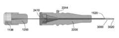 FIG. 13C is a side view of thedelivery catheter1000 according to the present technology in a position (Position 3) wherein the distal sheath of thedelivery catheter1400 penetrates the catheterproximal port2400 and thecannula1500 is entirely through thesampling hub lumen3000. This figure is a general outline of thesampling hub2200 with thedelivery catheter1000 and thesampling cannula1500 fully inserted.