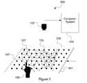 In one or more embodiments, a sensor grid is an M×N grid of evenly spaced sensor blobs105 that cover thecontent107. In one or more embodiments, eachsensor blob105 in the sensor grid functions independently, and all the location-bearing occlusion events are aggregated within thecomputer system103. The size of the sensor grid affects the spatial resolution of the sensing capability of the system and the degree of visual interference of the sensor blobs105 with the displayedvisual content107. The width of human fingers is an important measurement for determining the spacing distance betweenadjacent sensor blobs105 in the sensor grid. Although often empirically set, all the aforesaid parameters regarding the sensor grid may be automatically computed via a simple calibration procedure. In addition, the aforesaid calibration procedure may involve performing image analysis on the still images and/or video frames acquired using thecamera102 in order to determine the exact locations of the sensor blobs105 within the viewport.