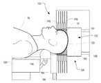 The center opening of thefrontmost antenna disk170 defines anentry opening169 for receiving a patient. Theentry opening169 is preferably surrounded by a protective ring182 (shown inFIGS. 6 and 7) covering the surfaces of theantenna disk170 and other portions of the workingchamber122.FIG. 10 is a view of theimage chamber unit131 similar to that ofFIG. 9, but with apatient support120 and acatch basin165 in place adjacent theunit131, andFIG. 11 is a view of theimage chamber unit131 similar to that ofFIG. 10 but shown with an upper portion of a patient'shead19 inserted into the entry opening. For comfort and convenience, the patient may be positioned on thepatient support120, which may be a gurney, cart, table, stretcher, or the like. In at least some embodiments of the present invention, aheadrest118 extends from the end of thepatient support120. Theheadrest118 is preferably padded and adjustable. Adjustability of theheadrest118 may be provided in one or more of the longitudinal direction (toward or away from the end of the patient support120), the vertical direction (up or down relative to the patient support120), and rotationally (for example, about an axis that is parallel with the end of the patient support120). In the illustrated embodiment, the entry opening and the workingchamber122 are sized to correspond specifically to a human head, but it will be appreciated that other dimensions may be utilized for other body parts or to accommodate the entirety of a human body. The entry opening is substantially liquid-sealed by themembrane133 such that the front of the workingchamber122 is separated by themembrane133 from the rear of thechamber122. Fluid leaks through the front of the workingchamber122, such as around or through themembrane133, may be captured in thecatch basin165 disposed in front of theunit131. It is contemplated that thecatch basin165 can be integral with or otherwise part of theimage chamber unit131.