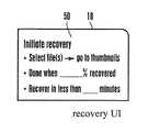 FIGS. 3 and 4 illustrate how a multimedia file may be recovered from the backed up copy. An example recovery user interface (UI)50 is shown inFIG. 3 that can be presented on thedisplay18 to permit a user certain options for recovering a multimedia file from a backed-up copy. As shown, the user may select a file to be recovered by entering the file name, or may choose to recover an entire directory or folder by entering the directory or folder name. Or, the user may click on the “go to thumbnails” option, which will cause the thumbnails generated atblock34 inFIG. 2 to be presented for selection of one or more underlying files for recovery by means of clicking on the associated thumbnail.