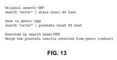 In another optimization, to achieve better computation distribution and minimize the amount of data transferred between indexers and the search head, many aggregating commands implement a map operation which the search head can delegate to the indexers while executing the reduce operation locally.FIG. 13 shows an example of asearch query1301 received from a client that the search head can split into two parts: one part to be executed byindexers1302 and one part to be executed by thesearch head1303. Here, thesearch query1302 makes the indexers responsible for counting the results by host and then sending their results to the search head. The search head then performs the merging1303. This achieves both computation distribution and minimal data transfer.