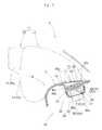 Theceiling region46 includes atearable section47 which is tearable when pushed by an inflatingairbag11. Thetearable section47 is designed to rupture faster at aleft region46aof theceiling region46 than at aright region46b. Thetearable section47 is composed of threeslits48a,48band48cwhich extend along a left and right direction in tandem in a interspaced fashion at the center in a front and rear direction of theceiling region46, atearable region47aformed between theslits48aand48band atearable region47bformed between theslits48band48c. Thetearable region47bformed between theslits48band48cis shorter in length than thetearable region47aformed between theslits48aand48b, thus theleft region46aof theceiling region46 ruptures faster than theright region46b.