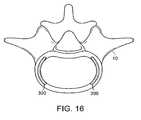 In some embodiments, the device can comprise a balloon of semicircular, circular, bilateral (comprising more than one balloon) and generally toroidal shape. Preferred embodiments and positions of a device of the present invention on anendplate8 of avertebra10 are shown inFIGS. 2 (a) through (e). Now referring toFIG. 2 (a), this shape allows theballoon12 to essentially cover at least theanterior periphery14 of the correspondingvertebral endplate8, and thereby bear a substantial portion of the spinal load. This shape further allows the surgeon to first place the device in place and then fill the remaining portion of the disc space with, for example, an osteobiologic component.