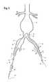 As shown inFIG. 1, acannula24 extends through the lumen of thepusher catheter10, from thedistal end8 of the device to immediately distal of thenose cone dilator20. Abranched stent graft4 may be retained on thedevice2, and, in one example, the proximal end of thegraft26 may be secured to thecannula24 by a retention arrangement immediately distal of thenose cone dilator20. Thebranched stent graft4 may also be retained at itsdistal end28 by another retention arrangement on thedevice2. Retention may be by various means, and in one non-limiting example, may include one or more loops or stitches of suture material which are engaged with a trigger wire extending from an aperture (not shown) in thecannula24. In another example, a trigger wire (not shown) may pierce or be woven through thestent graft4 directly, thus, retaining the graft against thecannula24 until the trigger wire(s) is removed. However, it is also contemplated that other types and methods of proximal and/or distal restraint may be used including various diameter reducing ties, fasteners or the like that are suitable for removably securing thestent graft4 on thedevice2. The retaining mechanisms may be placed in any suitable arrangement or location so that thegraft4 is removably secured to thedevice2. The proximal and/or distal ends of thestent graft4 may be released from this retention arrangement by releasing the one or more mechanisms (i.e. releasing a suture and trigger wire or any other type of mechanisms that may be used in combination with or in place of such sutures) during deployment of the graft, thereby facilitating at least partial deployment of thestent graft4 within a vessel lumen.