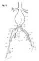 FIGS. 2-13 illustrate a portion of a patient's vasculature and an example of the various stages of the introduction, placement and deployment of a stent graft into a common iliac artery and an internal iliac artery.