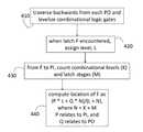 FIG. 4 illustrates the functional flow of an algorithm to compute latch location (F) according to an embodiment of the invention. The functions described with reference toFIG. 4 use a logic design developed in the technology-independent logic synthesis phase. The logic design indicates the connections amongPIs301,combinational logic gates620, latches610, andPOs302 but not any locations for the components. Atblock410, traversing backwards from eachPO302 and levelizingcombinational logic gates620 indicates traversing backwards across thecore area310 from aPO302 toward aPI301 and counting eachcombinational gate620 that is encountered. When alatch610 is encountered, assigning a level L, atblock420, includes assigning the least level hopped fromPO302 to thelatch610. From thelatch610 toPI301, as indicated byfunctional block430, counting combinational levels (combinational logic gates620) encountered as K and counting latch stages (latches610) encountered as M is done. The function atblock440 includes computing a location of thelatch610, F, as follows: