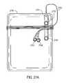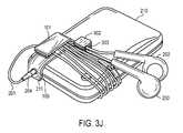 As stated above, the operation of thestrap2904 is similar to the operation of the straps described above with respect to almost all of the figures in this application. For example, thestrap2904 may be folded to form a loop, securing a cord wrapped around thecase2902 as illustrated inFIG. 29I. Also, as discussed above, while magnetic attachment mechanisms are described as existing at the attachment points2910 and2912 (shown inFIG. 29B), other attachment mechanisms are also envisioned. In other embodiments snaps, hook and loop mechanisms, Velcro, adhesives, magnetic beads, suction devices, van der Waals force attachment mechanisms, buttons, buckles, springs, bistable springs (e.g., a slap bracelet), sleeves that insert into slots, pegs that are inserted into holes, hinges, and snaps may be used. For example, in some embodiments, a hook portion of a Velcro attachment is provided atattachment point2910 while a loop portion of a Velcro attachment point is provided at2912 (or vice versa). When the two attachment points are brought into contact with one another, they will keep thestrap2904 in a looped position as shown inFIG. 29A. In another example, in some embodiments, a stud portion of a snap attachment is provided atattachment point2910 while a socket portion of a snap attachment point is provided at2912 (or vice versa). When the two attachment points are brought into contact with one another, they will keep thestrap2904 in a looped position as shown inFIG. 29A. In another example, in some embodiments, a button is provided atattachment point2910 while a button hole is provided at2912 (or vice versa). When these two attachment points are brought into contact with one another, they will keep thestrap2904 in a looped position as shown inFIG. 29A.
