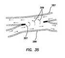 At this point, as illustrated inFIG. 33, thetoggle apparatus284 is withdrawn proximally along thesecond guidewire278, until thetoggle member285, in its open orientation, is pulled against the inner wall of thesecond vessel288, at a location selected for the creation of an elongated aperture which will form the desired fistula. This action initially functions to pull thesecond vessel288 into closer proximity to thefirst vessel287. Then, in one embodiment, radio-frequency (RF) energy is applied to the length of thetoggle member285. The RF energy functions to burn and fuse or weld the vessels together, creating anelongate aperture307 through the opposing walls of each of thefirst vessel287 andsecond vessel288, as well as any intervening tissue. Thiselongate aperture307 is shown inFIGS. 34 and 35. Alternative cutting approaches, such as resistive heat (hot wire), ultrasonic, laser, or mechanical approaches, may be used instead of RF energy, if desired. Energy may also be applied to opposing surfaces of the toggle delivery catheter.