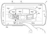 FIG. 6B is a diagram ofmobile device10 withscreenshot600bindisplay12.Screenshot600bprovides a zoomed-in view ofrotatable menu610.FIG. 6B also illustrates the use of a finger of an end user to interact with the email application to navigate horizontally (i.e., to the left, or counterclockwise) throughrotatable menu610, to change applications. Asrotatable menu610 is rotated, the email application may stop running in the foreground ofmobile device10 and move to the background. A music application, or a portion thereof, represented by content card612(n) may begin running in the foreground ofmobile device10 and potentially provide views to be displayed ondisplay12, which may be adapted to allow interaction by an end user. In at least one embodiment, the end user may also or alternatively navigate horizontally throughrotatable menu610 in the opposite direction (i.e., to the right, or clockwise).