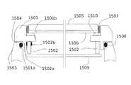 Shown inFIG. 15 is the upper part of thehousing1503 of the electronic device, which is joined with thebezel1401 at1504 e.g. by screws. The housing also includes a back cover (seeFIG. 17b) that may be integral with the wall portion of the housing, or a separate part fastened to it. A gasket in the form of an O-ring1508 or similar makes the device waterproof. Topmost inFIG. 15 is a glass cover orlens1505, which is fitted and secured to thebezel1501 by a shock-absorbing I-ring1507 of an elastomeric or plastic material, for example. A further shock-absorbingring1510 may be provided underneath and along the perimeter of the glass cover. An LCD-type display unit1506 is located beneath theprotective glass cover1505. The display unit may have touch sensitive functions and may be laminated onto the glass cover or lens.