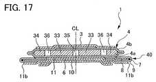 It is noted that theabsorbent body4 and thestretch sheet11 have therebetween the leakage preventing gather40 (which will be described later) and thus theabsorbent body4 is not directly joined to thestretch sheet11. InFIG. 16, in order to simply illustrate the joint position, the leakage preventing gather40 is not shown. In an actual case, thestretch sheet11 is adhered to be sandwiched between theside sheet9 constituting the leakage preventing gather40 and theback sheet6. The center of the laterallow rigidity section36 in the width direction means, for example, a position 3.75 mm away from one end of the laterallow rigidity section36, when the laterallow rigidity section36 has a width of 7.5 mm.