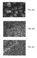 FIG. 8 is an example of series of 100× optical microscopy images of hMSCs grown on the carrier of the invention, illustrating (A) clumping of MicroHex™ carriers after 7 days of culture, no physical connection for (B) carriers with relief features of parallel ridges after 7 days of culture and (C) carriers with relief features of polystyrene beads after 6 days of culture.