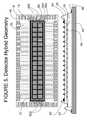 FIG. 15 shows the artwork for a ground planemetallic film120 which acts as a distribution grid for a circuit ground connection in the schematic ofFIG. 12 and the advancedPIN detector array5 ofFIG. 14.FIG. 16 shows the artwork for the siliconnitride insulating layer121 overlayed on the same ground planemetallic film120 of the preferred embodiment described in the associated text and diagram ofFIG. 14.FIG. 17 shows the artwork for the capacitivecathode ring contacts124 overlayed on the siliconnitride insulating layer121 and the ground planemetallic film120 of the preferred embodiment described in the associated text and diagram ofFIG. 14.FIG. 18 shows a top view of the completed assembly ofFIG. 14, including a view of the art work for the voltage planemetallic film122 overlayed on the insulatinglayer121, an outer portion of the capacitivecathode ring contacts124, and the ground planemetallic film120. Also shown is a top view of the metallicfilm anode contact127 and the tapering aspect of the trapezoidalPIN mesa structure126. The resistor RBIAS ofFIG. 12 is provided for byresistive film segment123, shown in 9 places onFIG. 18. The number ofindividual detectors57 shown inFIG. 18 is limited to a 3×3detector array5, for the purpose of clarity. Thenominal detector array5 in the preferred embodiment is 2×128, and the technology described is anticipated to be used on M×N detector arrays5 of 128×128 and larger.