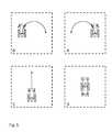 FIG. 5D illustrates a maneuver used in roll calibration. A vehicle is parked at a certain point and the vehicle's roll angle (about the longitudinal axis) is measured by an IMU in an autopilot. Next, the vehicle is parked over the same point, but headed in the opposite direction. (FIG. 5D shows the dashed outline of a tractor headed one way and the solid outline of the same tractor headed the opposite direction.) Roll angles measured with the two opposite headings are compared to find out what measured roll angle corresponds to “up” or perpendicular to the horizon.