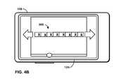 FIG. 4B depicts anothercomputing device10B displaying sample frames36B of video content in a carousel view during a fast forward, in accordance with another illustrative example in which a larger number of frames is displayed at one time ontouchscreen12B.Computing device10B may be a device with alarger touchscreen12B, such as a tablet computing device, and may be able to display many more frames at the same time than a smaller computing device, such as a smartphone. The media application may render the frame carousel to display the plurality of frames of the video output with a frame size such that at least a minimum number of the frames are displayed concurrently. For example, the media application may render the frame carousel with a default frame size for each frame, which may be selected so that computing devices with a minimum anticipated screen size display at least three frames at a time, while devices with larger screens will display a proportionally larger number of frames at any one point in time. Alternatively, the media application may detect the display size of the particular device on which the media application is executing or on which its output is to be rendered, and adjust the frame size of the frames in the carousel or frame reel within parameters based on the display size. The media application may also enable the frame size to be adjusted based on user-selected options. For example, on a device with a relatively larger display such ascomputing device10B inFIG. 4B, the media application may enable user configuration options for a user to select for either a small number of relatively large frames to be displayed concurrently (e.g., at least two, three, or four frames concurrently) or for a larger number of proportionally smaller frames to be displayed concurrently during the motion of the frame carousel across the screen during a fast forward or rewind of the video. This is one example of providing user-selectable frame size options, and displaying the plurality of frames of the video output with a frame size that is based at least in part on a user input to the user-selectable frame size options.