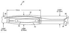 FIG. 2 is another view ofcatheter20 showinghousing portion32, a portion ofdistal portion30 andexit port34. In this figure theprimary guidewire38 has been loaded into the lumen ofcatheter20 and exits throughexit port34. Withinhousing section32 is ahousing member40 into which has been loaded anembolic protection device42 carried by a support wire orhost wire44.Housing member40 is shown as comprising a tubular shaped structure. However, other shapes are contemplated within the scope of the invention.Housing member40 defines an interior cavity or space for containing the embolic protection device in its collapsed or delivery configuration. The exterior dimensions ofhousing member40 are selected such that sufficient space is left withinhousing section32 to allow for passage of the primary guidewire.Host wire44 also exits the catheter lumen throughexit port34.Housing member40 can be secured at a fixed location withinhousing section32 as described in connection withFIGS. 5 to 7. Alternatively,housing member40 may comprise a shuttle component which can move axially withinhousing section32 between distal and proximal ends of the housing section as described in connection withFIGS. 3 and 4.