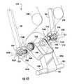 Stride height adjusting flexible members244 comprise an elongated flexible or bendable members such as cables, bands, wires, ropes, belts, cords, strings, straps, chains and the like that extend betweenadjustment member254 andfoot links228.Flexible member244L has a first end portion secured or connected toadjustment member254 and a second end portion secured or connected to foot link228L.Flexible member244L has central portions that wrap about an upwardly facing side of flexible member crankguide266L, a downwardly facing side ofguide238L and an upwardly facing side ofguide240L. Similarly,flexible member244R has a first end portion secured or connected toadjustment member254 and a second end portion secured or connected to foot link228R.Flexible member244R has central portions that wrap about an upwardly facing side of flexible member crankguide266R, a downwardly facing side ofguide238R and an upwardly facing side ofguide240R. Stride height adjusting flexible members244 link and control an extent to which foot links228 and their respective footpads230 pivot and move upwardly and downwardly.
