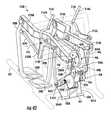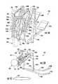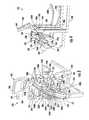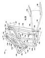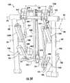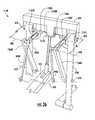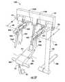 Foot links428 extend between arms426 andfootpads430. Each of foot links428 has an upper end pivotally connected to rearward extendingportion482 of the respective arm426 and a lower end supporting a respective one offootpads430. Each of foot links428 is further controlled bylink429 which has a first end pivotally secured to the respective one of foot links428 and a second end pivotally secured to guide462.Links429 connect foot links428 to guide462 via the pivoting member that holdsguide462.