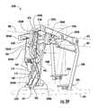 In one implementation, each oflinks429 is releasably connectable to the associated link428 at one of plurality of available vertically spaced mounting locations. For example, in one implementation, each foot link428 comprises a forwardly extending plate or year having column of vertically spaced apertures by which the end portion oflink429 may be pinned or otherwise mounted. Selectively repositioning the end oflink429 in one of the various vertically spaced attachment or mounting points on the associated foot links428 allows a person to adjust the range of stride length such that the minimum or maximum of the stride length would be uniformly larger or smaller. In one implementation, each oflinks429 may alternatively have a resiliently extendable/compressible length to provide cushioning. For example, one implementation, each oflinks429 may comprise a shock-absorber like hydraulic or pneumatic cylinder-piston shock assembly. In another implementation, each oflinks429 may comprise a resiliently compressible leaf spring, an elastomeric rubber-like link or other elongated member having a resiliently adjustable length.