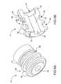 Thering sleeve136, like thepin sleeve122 may be configured for crimping the outer conductor orcoil134 within thecrimp portion208 of thering connector130. As shown inFIGS. 8A and 8B, thering sleeve136 may be formed as acylindrical sleeve portion222 with a flare orflange portion224 for controlling the depth within thecoil134 that thering sleeve136 extends. Thesleeve portion222 may be substantially cylindrical with an outer diameter slightly larger than an inner diameter of theouter coil134. As such, when inserted into a proximal end of theouter coil134, some frictional engagement between thering sleeve136 and theouter coil134 may be provided. The flare orflange portion224 may be positioned on the proximal end of thesleeve portion222 and may have an outer diameter larger than that of thesleeve portion222 for abutting the end of the outer conductor orcoil134 and resisting advancement of thering sleeve136 beyond the proximal end of the outer conductor orcoil134. The diameter of the flare orrib224 may be selected to be slightly less than the inner diameter of thecrimp portion208 of thering connector130 so as to avoid inhibiting the pinching or crimping of thecoil134 between thesleeve portion222 and the inner surface of thecrimp portion208 of thering connector130. As discussed with respect to thepin sleeve122, the shape of the proximal end of thepin sleeve122 and thering sleeve136 may depend in part on the type of raw material used to form the respective part. For example, if tubing is used, the proximal end may be flared, while, if bar stock is used, the proximal end may be more square in cross-section or flange-like. Other geometries may also be provided to stop the sleeves from advancing too far into the proximal end of therespective coils120,134.