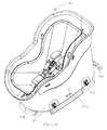 As shown inFIGS. 7 and 8, side wall220adefines fore and aft anchor boxes222aand222bfor receivingcorresponding tether connectors223aand223b, while side wall220bdefines fore and aft anchor boxes222cand222dfor receivingcorresponding tether connectors223cand223d, thereby permitting thecar seat210 to be connected to the vehicle in either a forward-facing or a rear-facing orientation. Thetether connectors223a-223dcan be LATCH or ISOFIX connectors, which are well known. The anchor boxes222a-222dare generally located proximate to the “corners” of theouter shell220 as shown inFIGS. 7 and 8. Though not shown inFIG. 8, optional anchor boxes can be located in the front wall220dand/or the back wall220c.