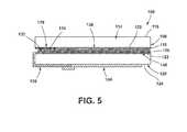 In some embodiments, ink is used to form theappliqué104 on thefourth surface124 of a transflectiveelectrochromic mirror element108 as shown in, for example,FIG. 3. The ink is applied directly to thefourth surface124 of theglass substrate120. A clip used forelectrical contact130 is positioned on top of theappliqué104. Using this construction, the contact130 (e.g., a clip) is hidden from view when themirror element108 is viewed from the front (e.g., as viewed throughsubstrates114 and120). This construction is particularly useful when the optical transmission level of themirror element108 is above 30%. Formirror assemblies100 havingmirror elements108 with particularly high transmission levels, other means of hiding thecontact130, such as applying ink over a clip affixed to thesubstrate120 with black adhesive (e.g., as shown inFIG. 4A) may be less effective or ineffective. As such, when the optical transmission of themirror element108 is above 30%, the need for a very uniform backing is important and a configuration ofmirror assembly100, such as depicted inFIG. 3, is particularly advantageous.