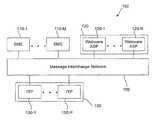 FIG. 1 illustrates a high-level overview of amessage interchange system100 according to the present invention.Message interchange system100 includes amessage interchange network150 that enables SMEs11 O-m, webware ASPs120-n, and in-transit processors (ITPs)130-pto connect to one another, integrate business processes and applications, and exchange data for mission-critical business functions. In general, ITPs130-pare operative to process messages that are in-transit from a sender to a recipient. ITPs130-pcan be designed to perform a variety of functions such as data transformation, enrichment, cross-reference ID mapping, filtering, credit scoring, or the like.